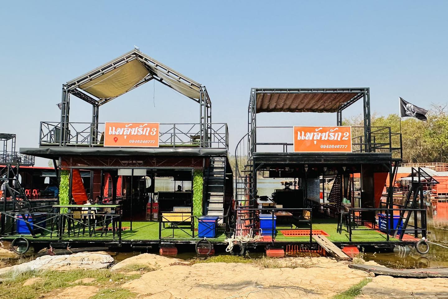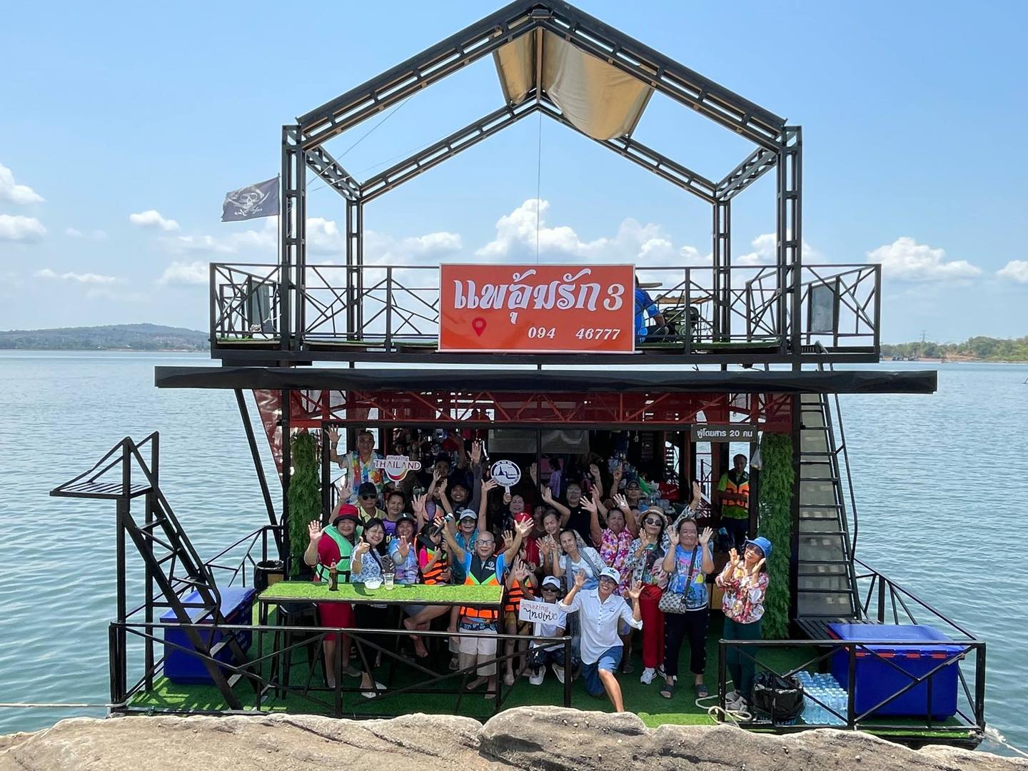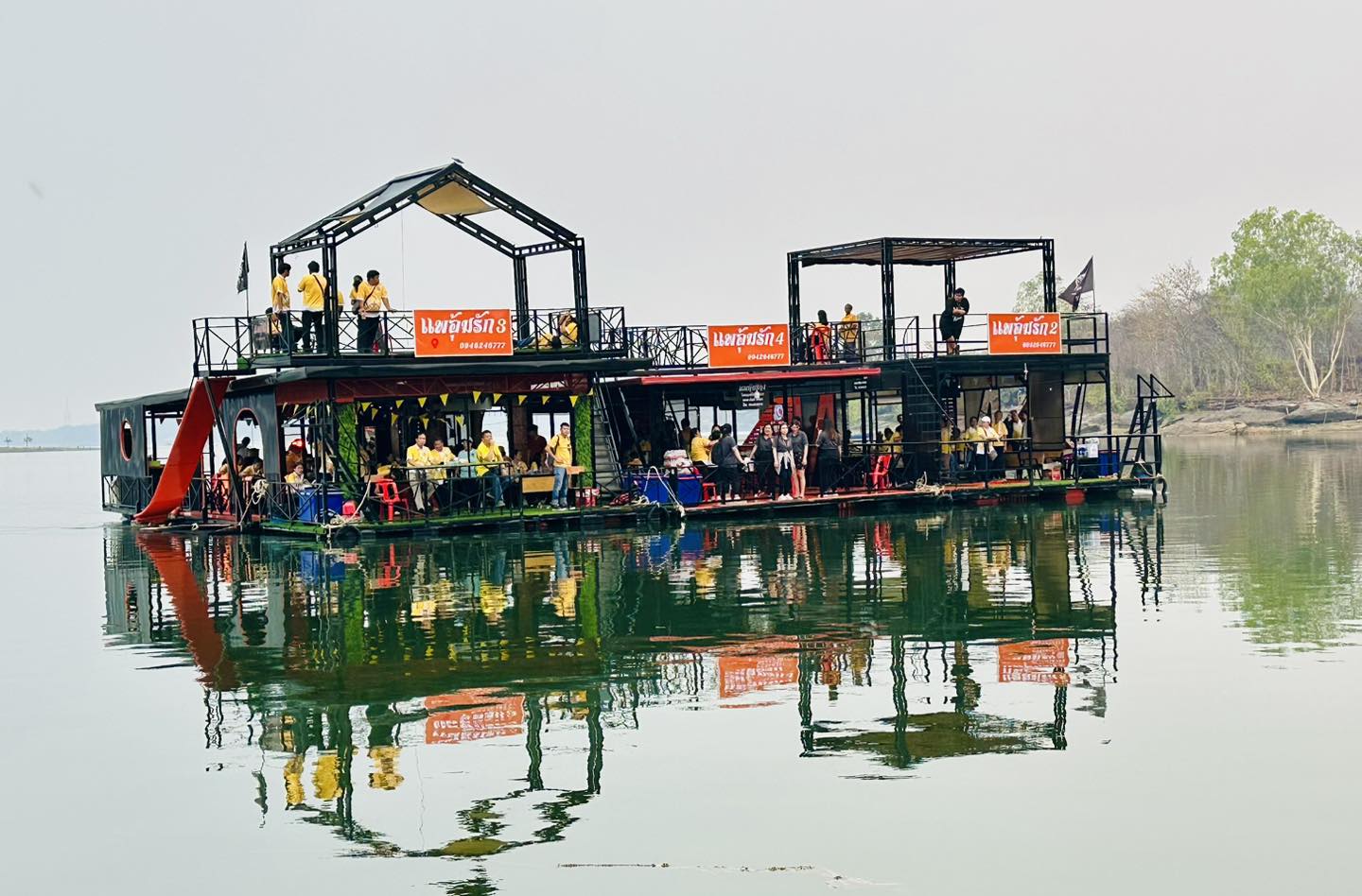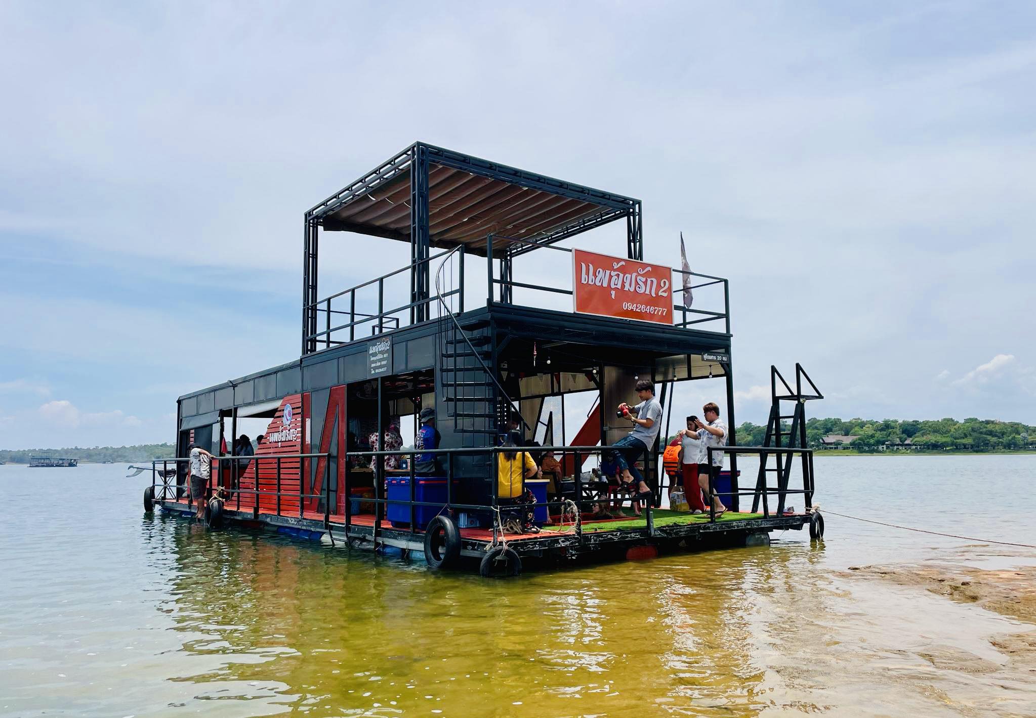 ล่องแพลำโดมน้อย(ท้ายเขื่อนสิรินธร) แพอุ้มรัก มีสไลเดอร์ติดข้างแพ บ่อน้ำสำหรับเด็ก เครื่องเสียงคาราโอเกะ อุปกรณ์เครื่องครัว แพเปียกเล่นน้ำ ชั้นลอยชมวิว