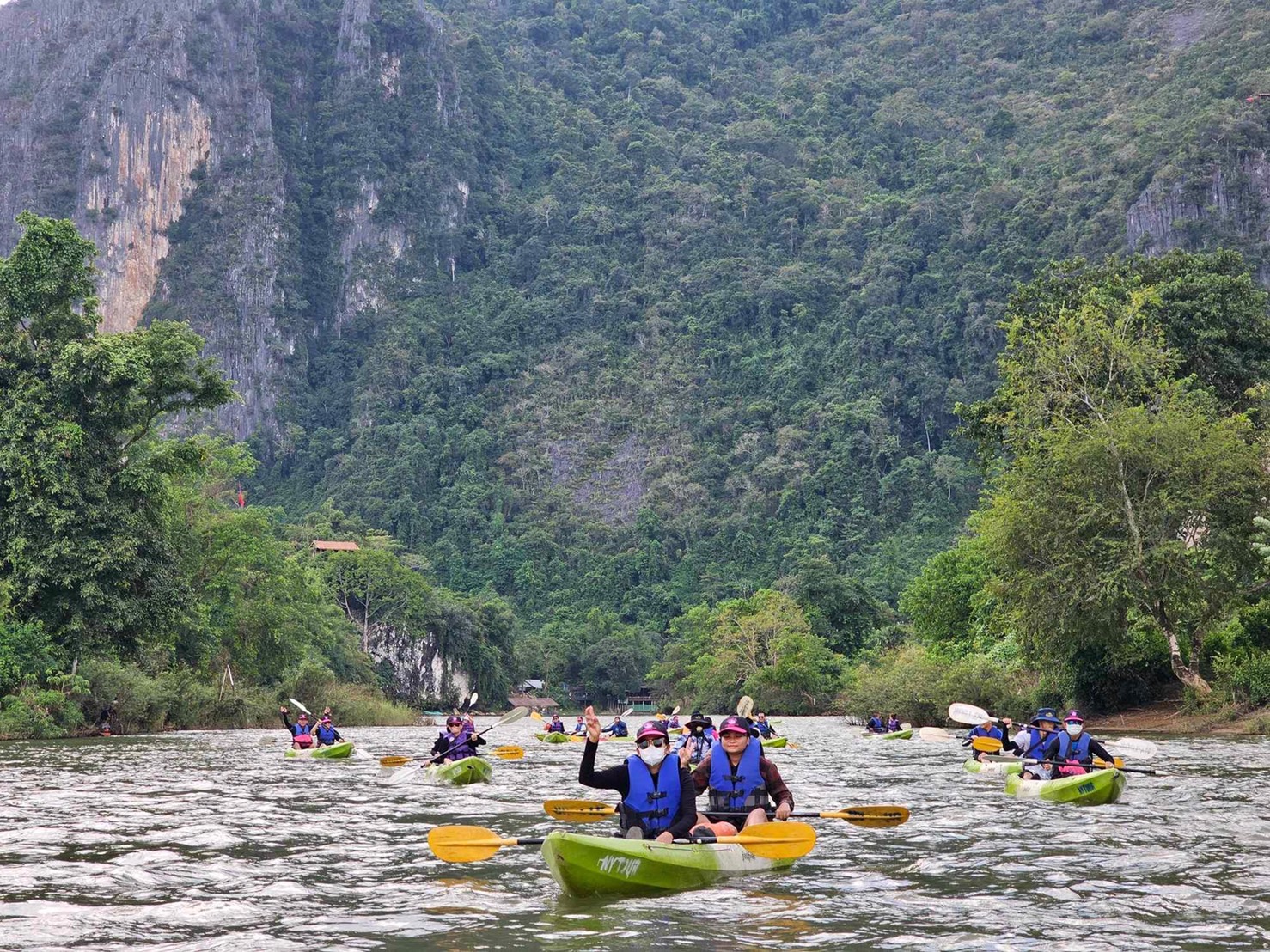 15.00น. คณะเดินทางถึง เมืองวังเวียง ดินแดนสุขาวดี มีธรรมชาติงดงามด้วยภูเขาหินปูนสูงชันตั้งเด่นตระหง่าน มีแม่น้ำซองที่ใสสะอาดไหลผ่าน อากาศเย็นสบาย เป็นสถานที่นักท่องเที่ยวต่างชาตินิยมมา ต่างให้สมญานามว่า กุ้ยหลินแห่งเมืองลาว