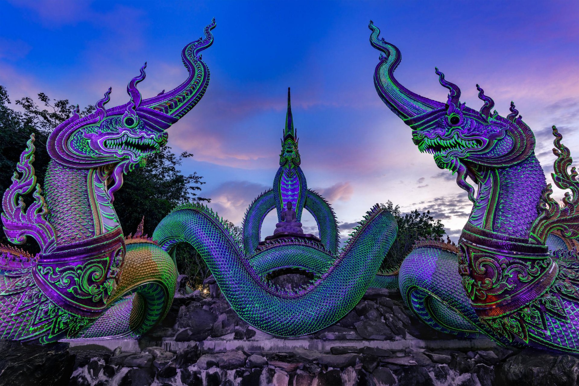 16.30น.นำคณะความงดงามตระการตาไว้อย่างน่าอัศจรรย์ ที่ วัดสิรินธรวราราม (ภูพร้าว) Unseen Thailand "ศิลปกรรมต้นไม้เรืองแสง" คือภาพเรืองแสงของประติมากรรมต้นกัลปพฤกษ์ที่ติดอยู่ผนังหลังโบสถ์ หรือต้นไม้สารพัดนึกอยู่ด้านหลังอุโบสถของวัดความมหัศจรรย์ของภาพต้นไม้ที่ค่อยๆ เปล่งแสงสว่างขึ้นสวนทางกับท้องฟ้าที่ค่อยๆ มืดลงยามพลบค่ำ มันเป็นภาพที่ประทับใจจนต้องนำมาบอกต่อ ตัวภาพต้นไม้จะคล้ายกับที่เคยเห็นในวัดเชียงทองที่หลวงพระบาง เก็บภาพแห่งความประทับใจ