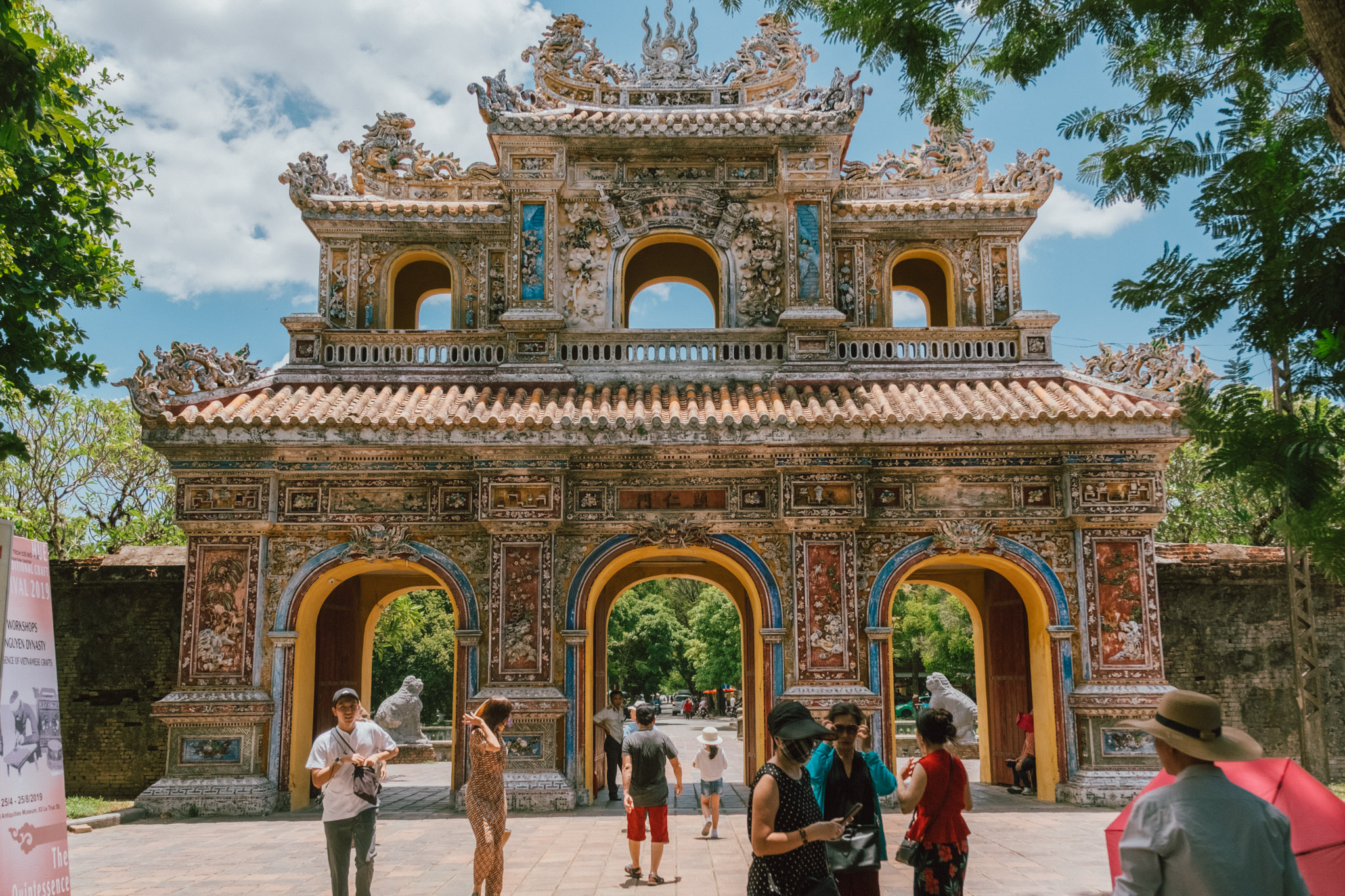 นำท่านชม เมืองเว้ เมืองหลวงเก่าเวียดนามในอดีตยาวนานมาถึง 143 ปี ก่อนที่ระบบกษัตริย์จะ ล่มสลายไปกับสุดท้ายที่ตระกูลเหงียน นำท่านถ่ายรูปที่ระลึกหน้า พระราชวังโบราณ หรือ นครจักรพรรดิ ( DAI NOI ) ที่มีกำแพงล้อมรอบ 3 ชั้น สร้างในปี ค.ศ. 1845 พระราชวังแห่งนี้สร้างตามความเชื่อแบบจีนโดยพระราชวังวังแห่งนี้จึงสร้างแบบพระราชวังกู้กง หรือพระราชวังต้องห้ามของจีน แต่มาถูกทำลายเสียหายจากระเบิดไปอย่างมากในสมัยสงครามเวียดนามนั่งสามล้อชมรอบๆพระราชวัง