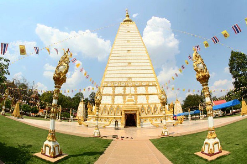 บ่าย แวะไหว้พระที่ วัดพระธาตุหนองบัว มีพระบรมธาตุเจดีย์ที่จำลองแบบมาจากประเทศอินเดีย บรรจุพระบรมสารีริกธาตุ ตั้งโดดเด่นอยู่กลางเมืองอุบลฯนมัสการขอพรพระอิ่มบุญแล้ว พร้อมซื้อของฝากเมืองอุบลฯ ไม่ว่าจะเป็น หมูยอ เส้นก๋วยจั๊บ กุนเชียง เพื่อฝากคนทางบ้าน