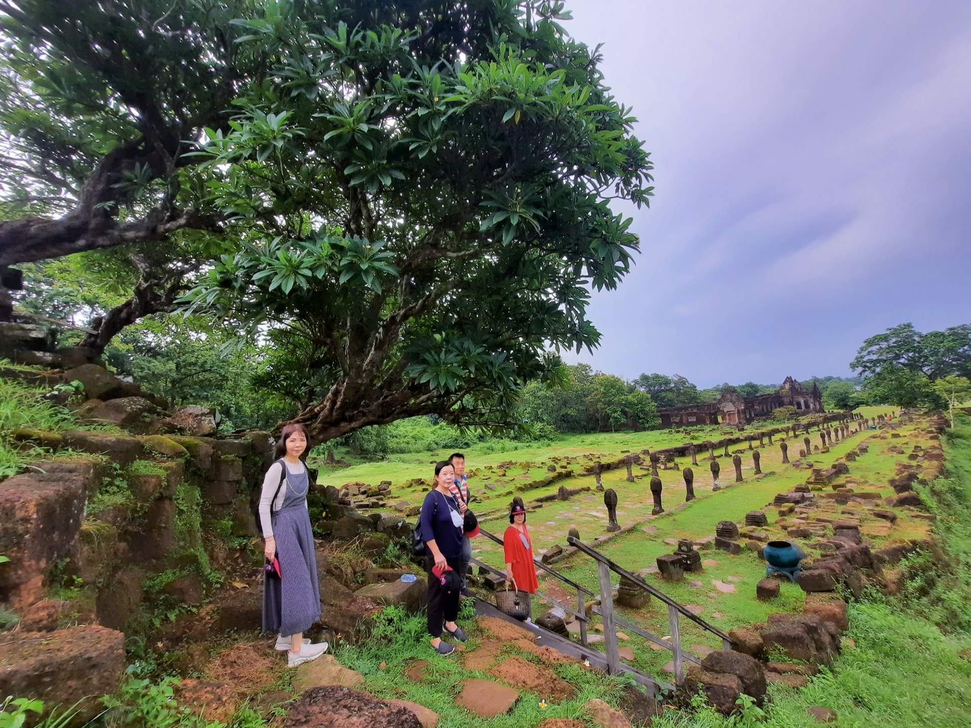 จากนั้น ออกเดินทาง สู่ เมืองจำปาสัก อดีตนครหลวงลาวใต้ เพื่อไปชมมรดกโลก ปราสาทหินวัดพู จุดเริ่มต้นของอาณาจักรขอมโบราณ เป็นปราสาทขอมแห่งแรก ลักษณะของปราสาทเป็นเทวสถานขอม คล้ายกับเขาพระวิหาร มีอารยะธรรมโบราณถึง 3 สมัยด้วยกัน คือ อาณาจักรเจนละในช่วงศตวรรษที่ 6-8 อาณาจักรขอมสมัยก่อนเมืองพระนคร และสุดท้ายอาณาจักรล้านช้าง ซึ่งต่อมาก็คือประเทศลาวในปัจจุบัน ทำเลที่ตั้งสวยงามมาก ชาวลาวเรียกว่า “ภูเก้า” เก็บภาพแห่งความภาคภูมิใจ