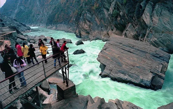จากนั้น นาท่านเดินทางสู่ หู่เที่ยวเสีย (ช่องแคบเสือกระโจน)เป็นร่องน้ำเชี่ยวในหุบเขาที่มีความยาวต่อเนื่องกันถึง 25 กม. มีแก่งอันตรายถึง 18 แห่ง จึงไม่มีใครกล้าล่องแก่งในแถบนี้ จุดแคบที่สุดวัดได้ 30 เมตร และเป็นช่องแคบที่ลึกที่สุดในโลกคือประมาณ 3,900 เมตร ตานานเล่าว่าในอดีตมีเสือกระโดดไปฝั่งตรงข้ามได้จึงเป็นที่มาของ ช่องแคบเสือกระโจน