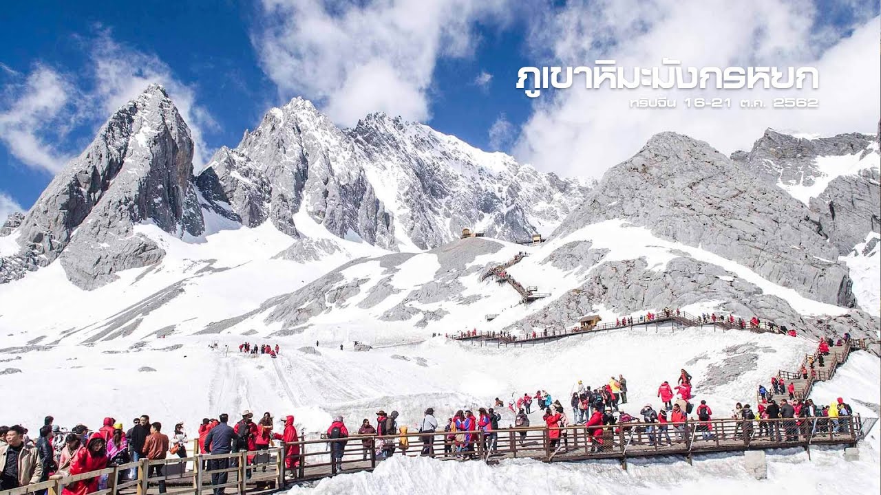 จากนั้น นำท่านเดินทางสู่ ภูเขาหิมะมังกรหยก นำท่านนั่งกระเช้าใหญ่ ขึ้นสู่ภูเขาหิมะมังกรหยก สู่จุดชมวิวสูงสุดจากระดับนำทะเล 4506 เมตร เพื่อชมวิวทิวทัศน์ และธรรมชาติบนจุดที่สูงที่สุด และสวยงามที่สุด ตลอดสองข้างทางที่ขึ้นยอดเขา ทิวเขาแห่งนี้เมื่อมองจากระยะไกล จะเห็นเป็นลักษณะคล้ายมังกรกาลังเลื้อย บนพื้นสีขาวของหิมะที่ปกคลุมอยู่นั้น ดูราวกับหยกขาว ที่ตัดกันสีน้ำเงินของท้องฟ้า คล้ายมังกรขาว กำลังล่องลอยอยู่บนฟากฟ้าเขาแห่งนี้จึงได้ชื่อว่าภูเขาหิมะมังกรหยกให้ท่านได้ชื่นชมและดื่มด่ำกับความหนาวเย็นของธรรมชาติ
