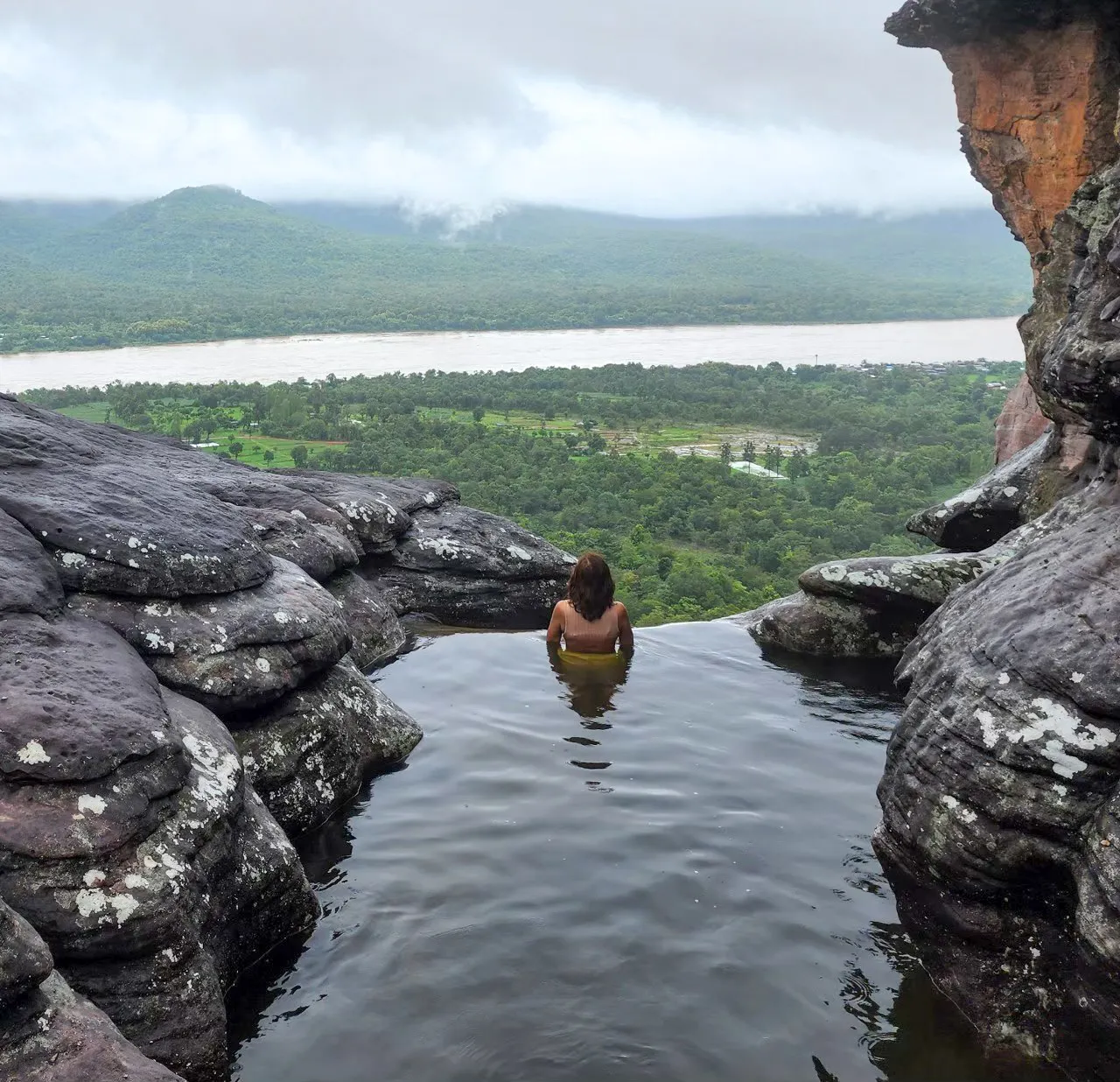 จากนั้น เดินทาง สู่ ผาโสก เป็นแอ่งน้ำธรรมชาติ ที่ตั้งอยู่ริมหน้าผา ที่สามารถมองเห็นวิวของแม่น้ำโขง ภูเขา และ ป่าต่างๆ ได้สวยงามมาก นักท่องเที่ยวจะนิยมมาแช่น้ำ ชมวิวสุดอลังการนี้กัน เหมือนเป็นอ่างกุซซี่ธรรมชาติลอยฟ้าที่หาที่ไหนไม่ได้อีกแล้วในประเทศไทย