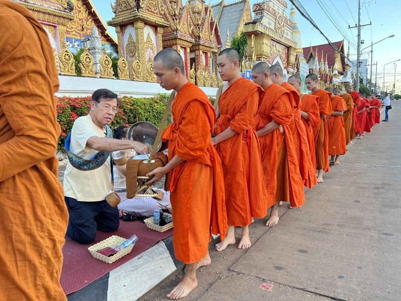 เช้า...อรุณสวัสดิ์ยามเช้า ร่วมสืบทอดประเพณี ทำบุญตักบาตรข้าวเหนียวแด่พระสงฆ์ (ประมาณ50รูป) ที่หน้าวัดหลวงปากเซ (ไม่บังคับแล้วแต่ลูกค้า แจ้งไกด์ได้เลย) เสร็จแล้ว รับประทานอาหาร ณ ห้องอาหารของโรงแรม