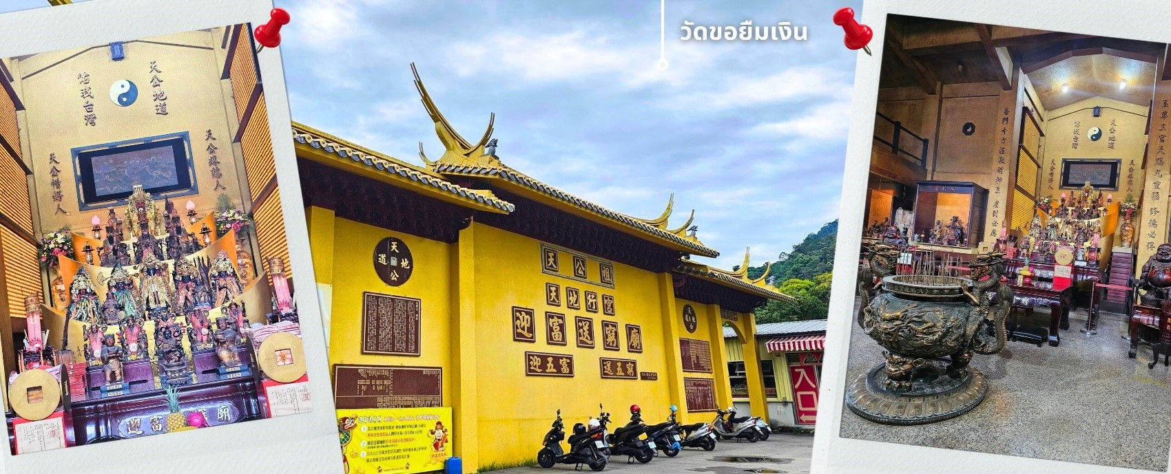 จากนั้น นำท่านนั่งรถโค้ชปรับอากาศเดินทางสู่ วัดขอยืมเงิน วัดชื่อดังแห่ง มณฑลเถาหยวน ใกล้ไทเป ที่มีความเชื่อไม่เหมือนใคร คือผู้คนสามารถ “ยืมเงินจากเทพเจ้า” ได้จริง เพื่อเสริมดวงด้านโชคลาภ การงาน และการเงิน เดิมชื่อ วัดเทียนกง เป็นวัดขนาดเล็ก แต่ด้วยความศักดิ์สิทธิ์และมีชื่อเสียงเรื่องขอพรโชคลาภเงินทองโดยเฉพาะการปัดเป่าไล่ความจน จุดเด่นของวัดนี้อยู่ที่พิธีกรรมโบราณที่ผสานวัฒนธรรมจีน เช่น การขอ “เงินโชคลาภ”และการเผากระดาษคืน “ความจน” โดยเชื่อกันว่าใครที่มายืม จะต้องนำเงินมา “คืน” ภายใน 1 ปี พร้อมถวายคืนด้วยจิตกตัญญู เพื่อส่งต่อความมั่งคั่งให้ไม่ขาดมือ ผู้คนจึงเลื่อมใสศรัทธาและหลั่งไหลมากราบไหว้ขอพรกันไม่ขาดสายหลักๆ แล้วผู้คนมักจะมากราบไหว้ เทพเจ้าบรรพบุรุษเทียนกง เทพเจ้าตันตวนต้าตี่ และ เทพเจ้าจี้กง ซึ่งมีชื่อเสียงในด้านการปัดเป่าสิ่งไม่ดีและเพิ่มความมั่นคง
