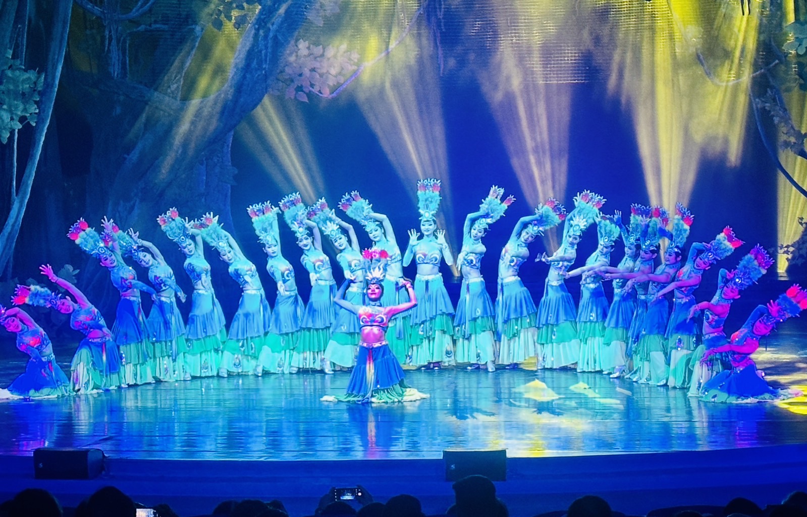 จากนั้น ชมสวนป่าดงดิบ ชมการแสดงที่มี ฝูงนกยูง ประมาณนับร้อยตัว ที่ได้ยินเสียงนกหวีดก็พากันบินมากินอาหารพอกินเสร็จแล้วก็พากันบินกลับรัง พื้นป่าที่อุดมสมบูรณ์ด้วยพืชพันธุ์นานาชนิดสัมผัสกับธรรมชาติป่าไม้ที่ร่มรื่นมหัศจรรย์กับต้นนกยูงต้นไม้ที่มีลักษณะคล้ายนกยูงซึ่งชาวเมืองสิบสองปันนาเชื่อว่าเป็นสถานที่ศักดิ์สิทธิ์ของเหล่านกยูงชมการแสงของเหล่านางเงือกและชมพันธุ์ปลาหายากหลากหลายพันธุ์ที่ Underwater World เก็บภาพบรรยากาศ